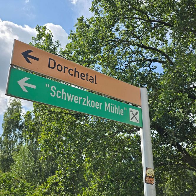 Die Tour führt Dich durch das Dorchetal mit seinen alten Wäldern, Feuchtwiesen und kleinen Schluchten zur Schwerzkoer Mühle. Mühlen waren Grundpfeiler und Symbol klösterlicher Handwerkskunst – importiert aus Italien. Bereits im Mittelalter betrieben die Neuzeller Mönche entlang der Dorche mehrere Wassermühlen – darunter die Schwerzkoer Mühle, eine der ältesten im Stiftsland.