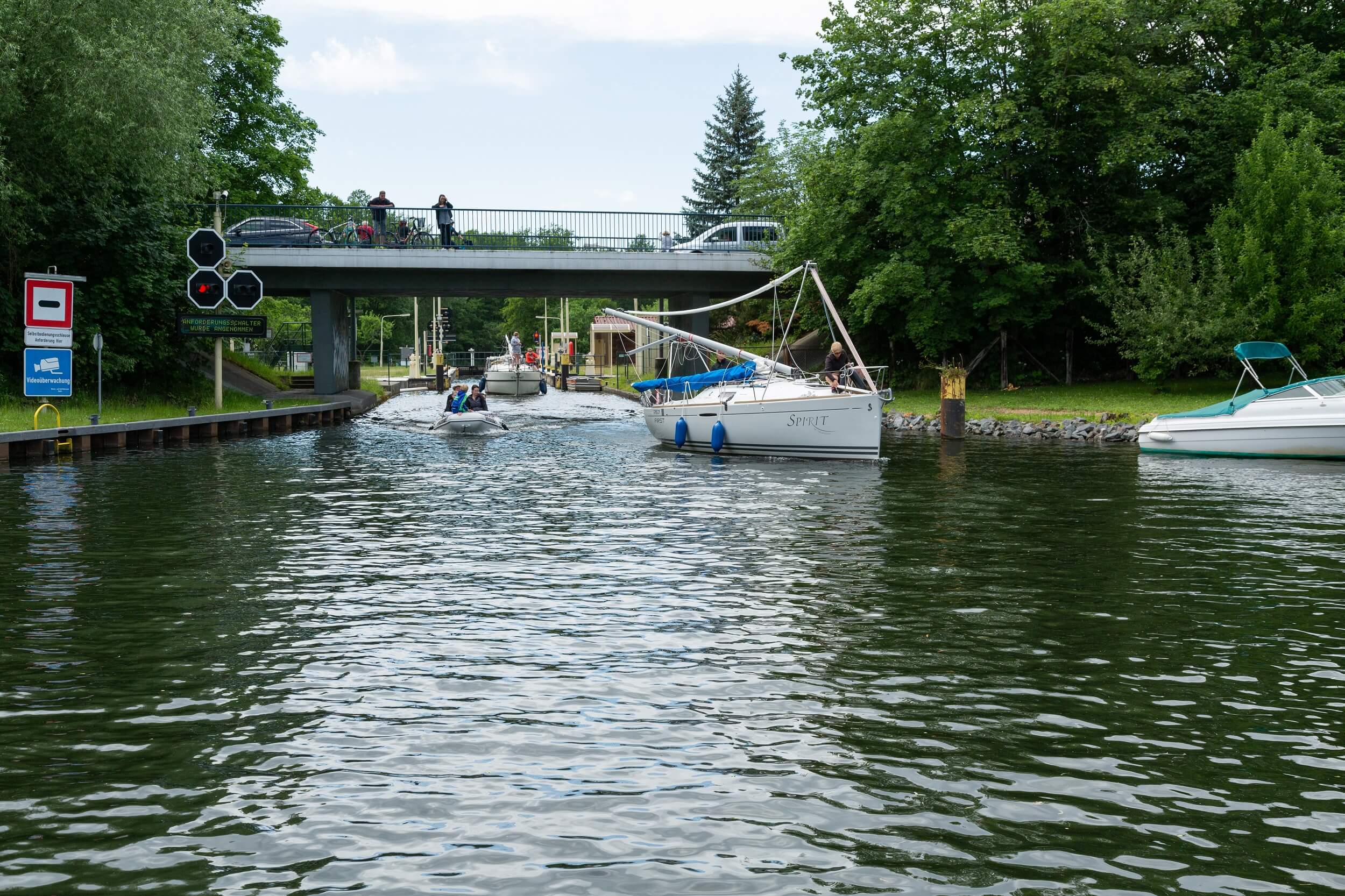 Die Geschichte der Brücke über die Schleuse ist ebenso bewegt: Nach dem Einsturz der Zugbrücke 1929, folgten ein Neubau 1933 und eine Sprengung 1945 durch einen SS-Offizier. Eine Notbrücke wurde noch am selben Tag errichtet, der heutige Brückenneubau stammt aus dem Jahr 1965.